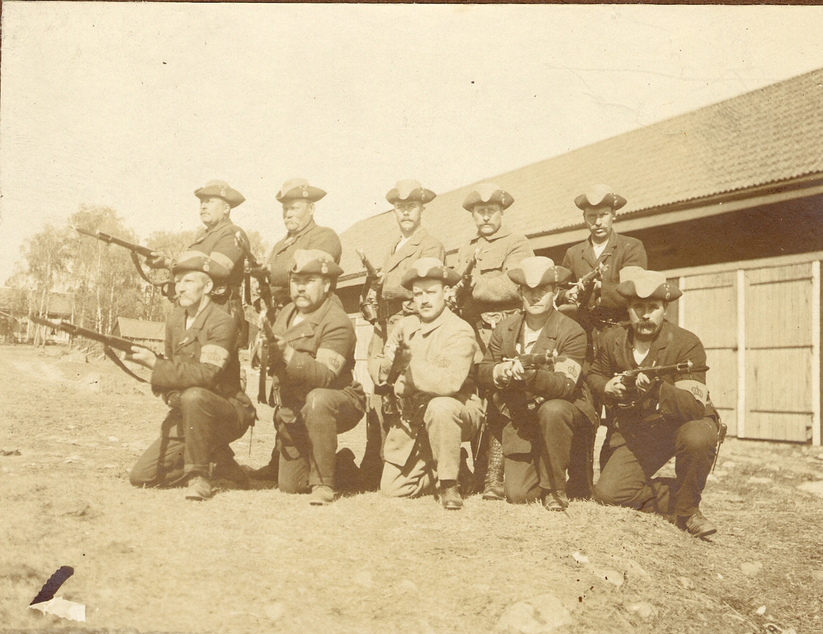 Män i Landstormsuniform uppställda med gevär i hand i trädgård i Löttinge, Täby, 1914.