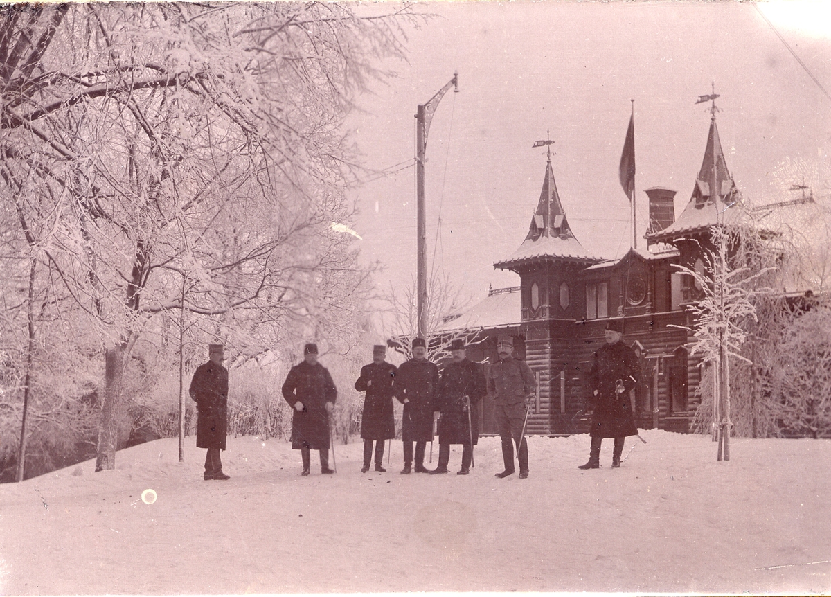 Sju officerare står framför Ingenjörkårens mäss, 1903.