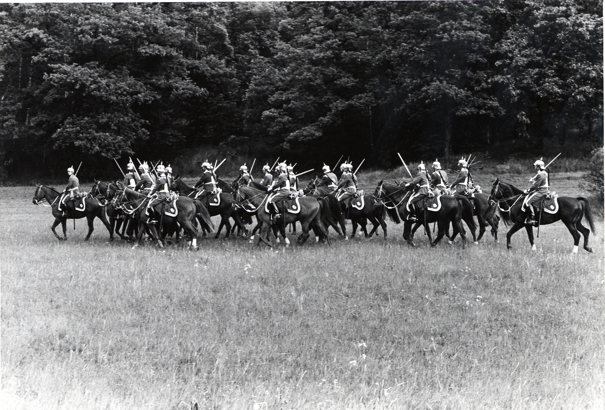 Titel: Livgardets dragoner K 1, uppvisning av kavalleriattack på Fisksjöäng.