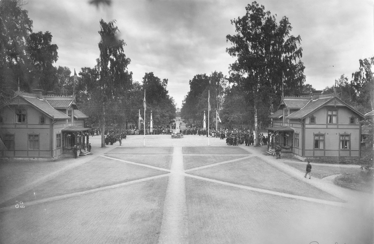 Västmanlands infanteriregemente I 18 uppställt på lägergården i Rommehed midsommardagen 1925. Utsikt från officerspaviljongen mot regementsluckan och exercisfältet.