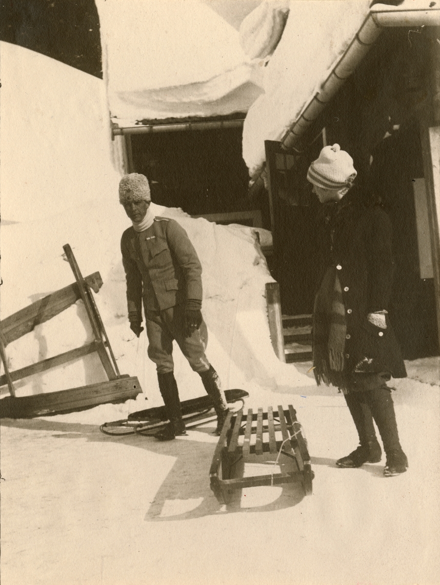 Titel: Man och kvinna vid kälke i vinterlandskap.