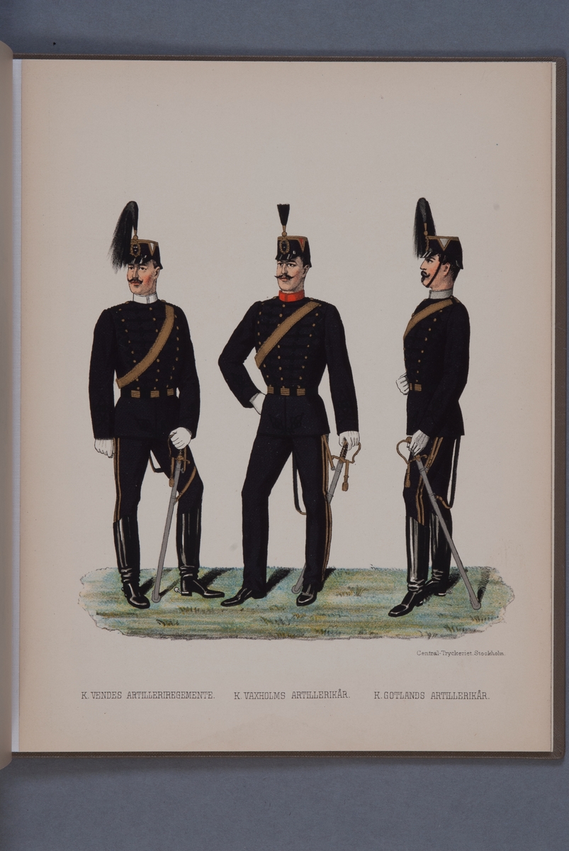 Plansch i färgtryck med uniform för Wendes artilleriregemente, Vaxholm artillerikår och Gotlands artillerikår. Ingår i boken Svenska arméns och flottans uniformer, utgiven av P.B Eklund 1891.