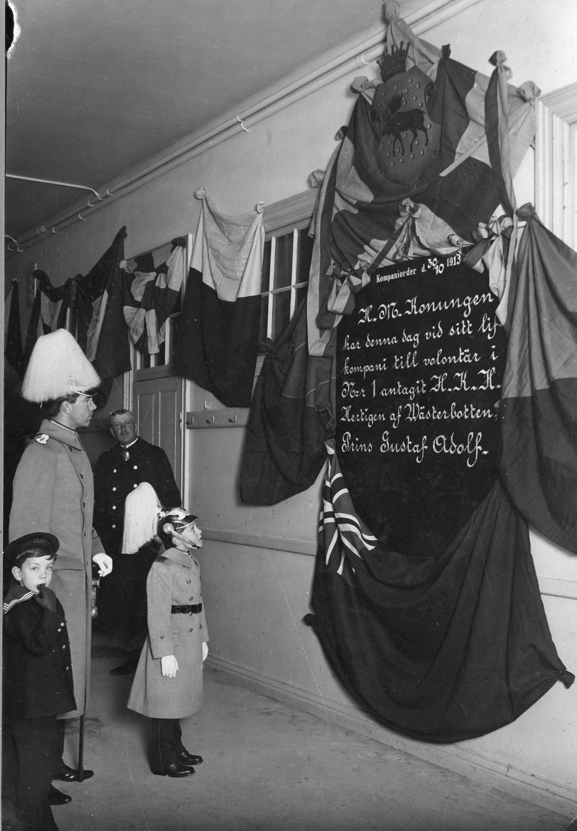 Hertigen av Skåne, Gustaf (VI) Adolf, läser Svea livgardes, I 1, kompaniorder vid regementets jubileum 1913. De två barnen är sönerna prins Sigvard till vänster och arvprins Gustaf Adolf till höger.