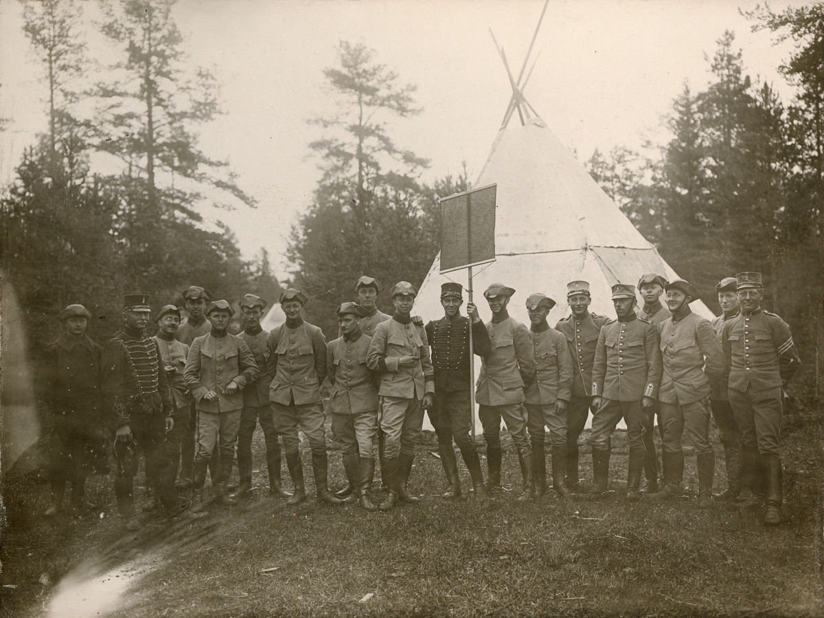 Titel: Gruppbild framför ett tält med soldater från Kavalleriskolan i Umeå.