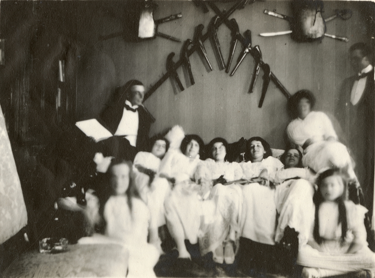 Män och kvinnor i rustkammare, troligen vid prins Carls villa Parkudden på Djurgården i Stockholm.