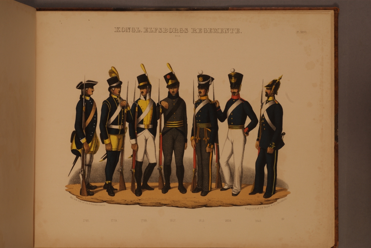 Plansch med uniform för Älvsborgs regemente för åren 1765-1845. Plansch i färgtryck efter original av Adolf Ulrik Schützercrantz. Ingår i planschsamlingen Svenska krigsmaktens fordna och närvarande munderingar.