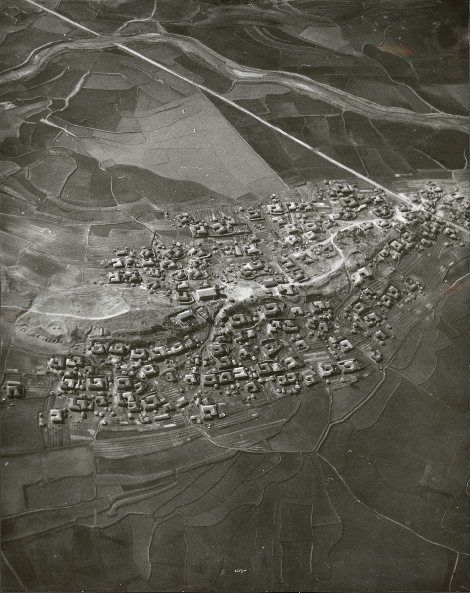 Titel: Flygfoto över ett samhälle.