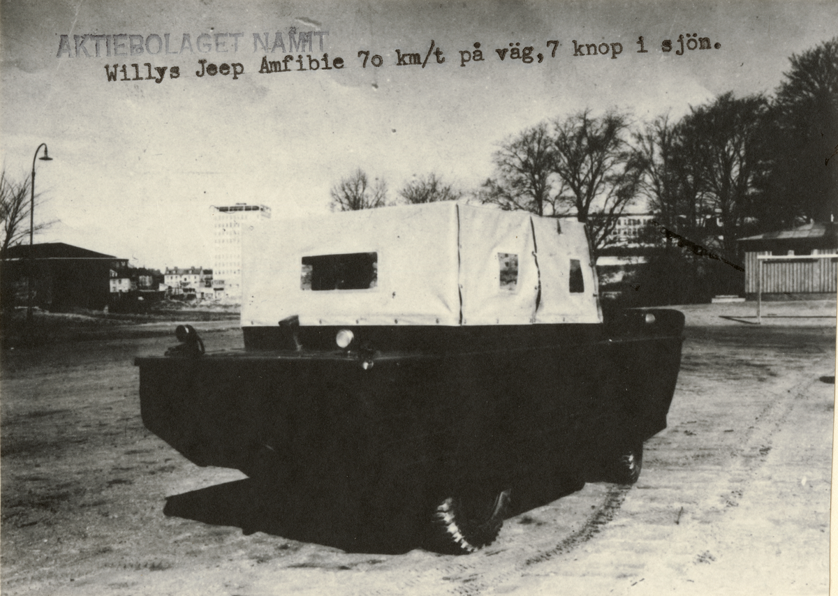 Text på bilden: "Willys Jeep Amfibie 70 km/t, 7 knop i sjön".