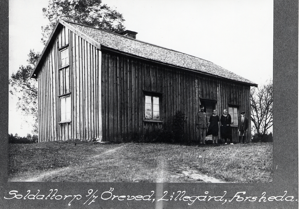 Soldattorp 9/7 Öreved Lillegård Forsheda, soldat i uniform m/1910 med familj utanför stugan.