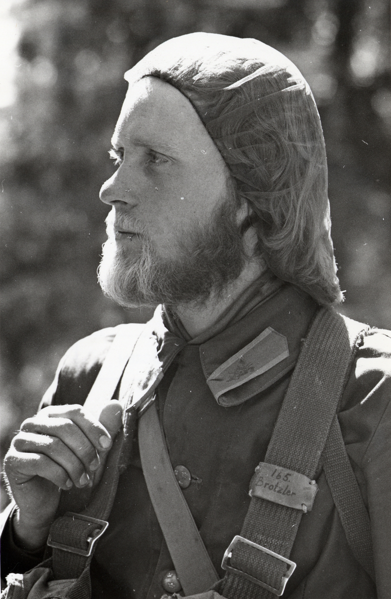 Titel: Närbild på man ur infanteriet i uniform m/1959 med skägg och hårnät.