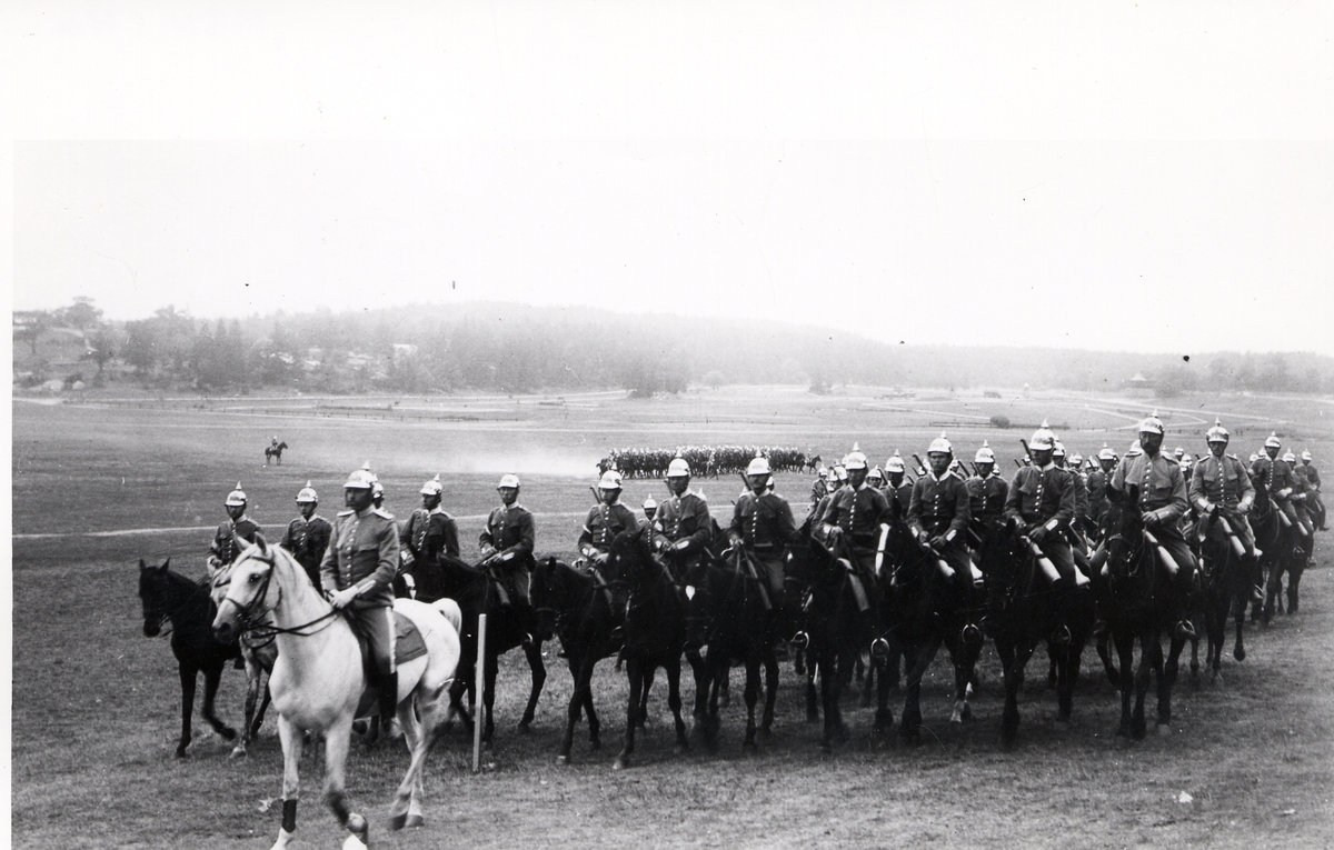 Titel: Kavalleritrupp ur Svea livgarde K 1 till häst på stort fält i uniform m/1895.