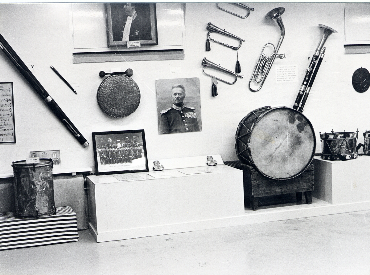 Göta livgardets regementsmuseum interiör, vägg med musikinstrument.