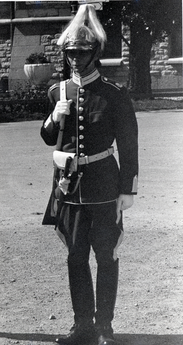 Titel: Kavallerist i uniform m/1895 för Livgardet till häst med gevär m/1896 på ryggen.