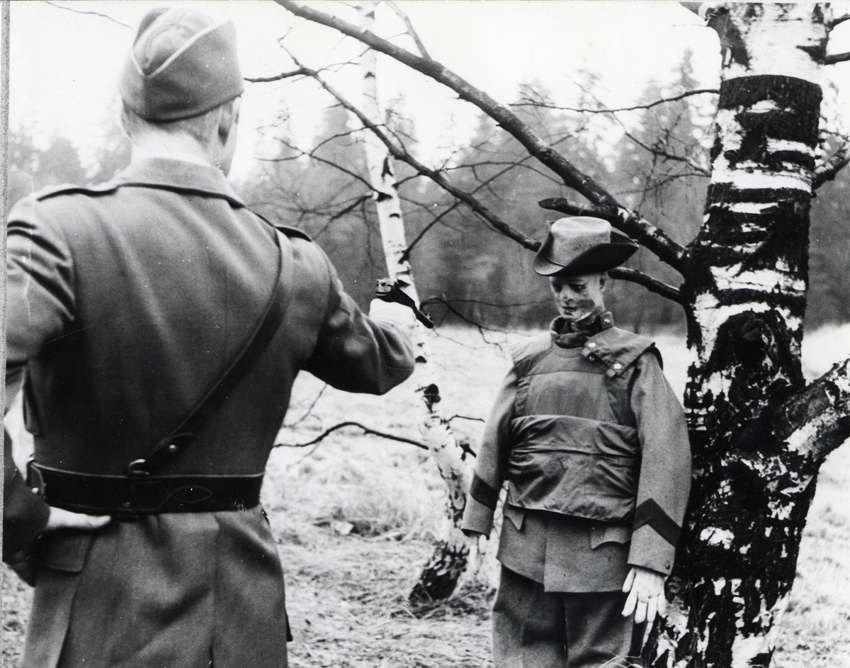 Officer i uniform m/1939 skjuter mot docka i uniform m/1910 med en automatpistol m/1940 för utprovning av skyddsväst.