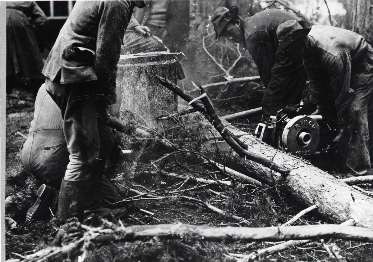 Ingenjörstrupper, broslagning, motorsåg används till att kapa grenar. Soldater i uniform m/1910.