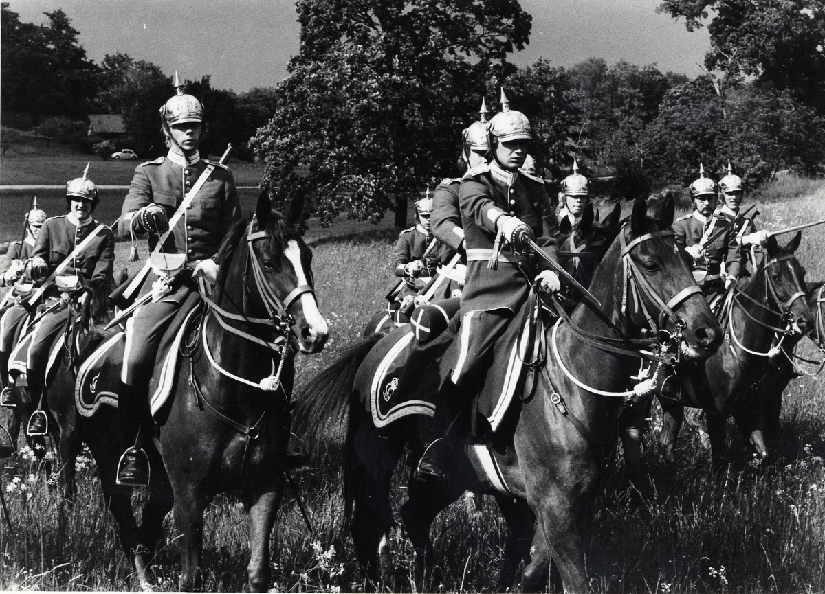 Titel: Livgardets dragoner K 1, uppvisning av kavalleriattack på Fisksjöäng.