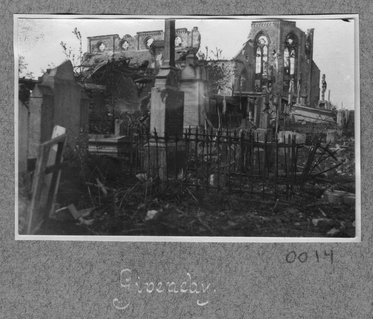 Titel: Kyrka med bombskador.