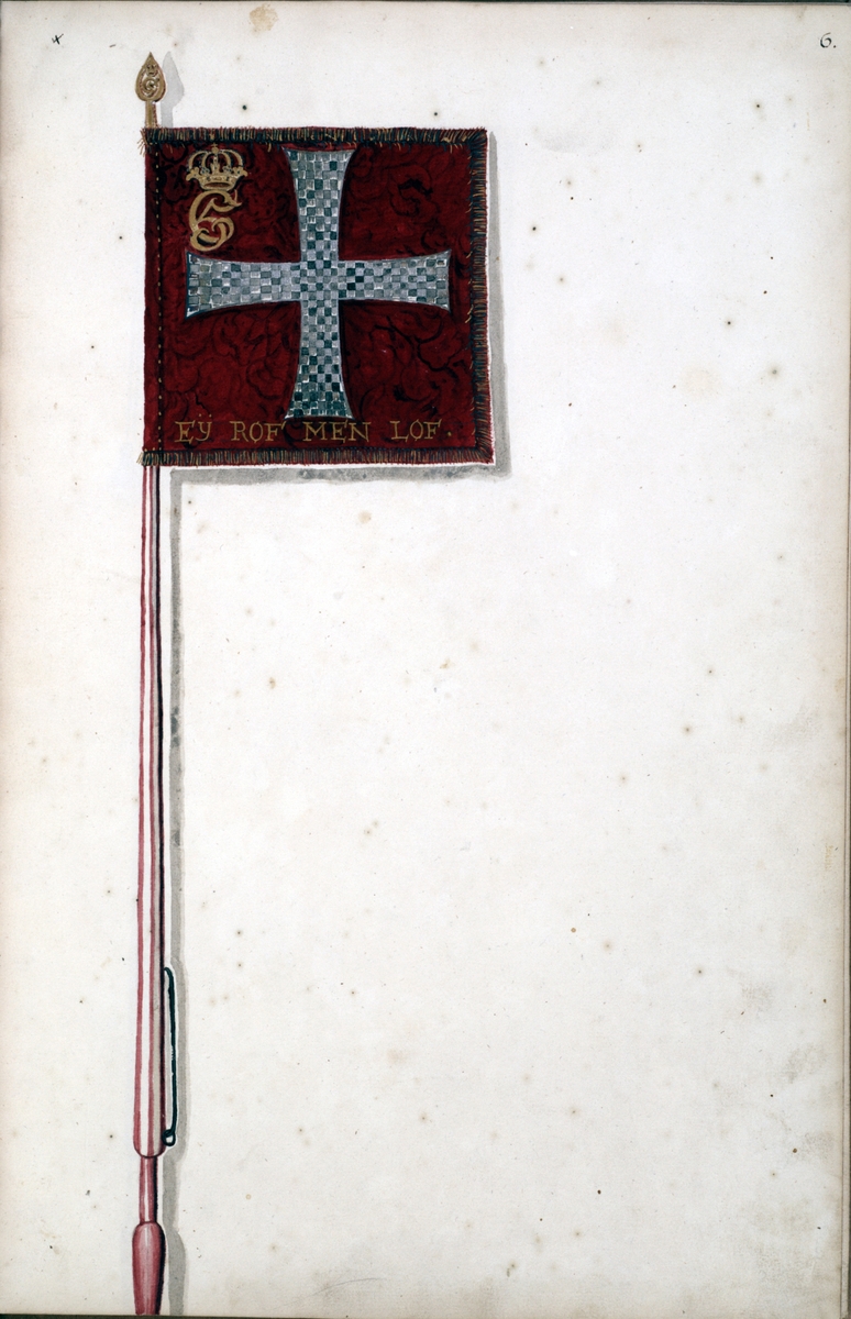 Titel: Avbildning i gouache föreställande fälttecken taget som trofé av svenska armén. Det avbildade standaret finns inte bevarat i Armémuseums samling.