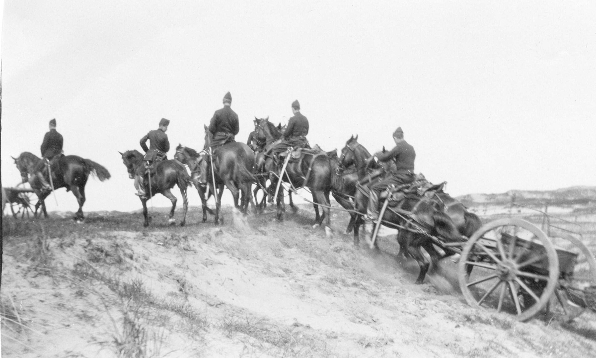 Okänt artilleriförband rider över sanddyn,1890-tal.