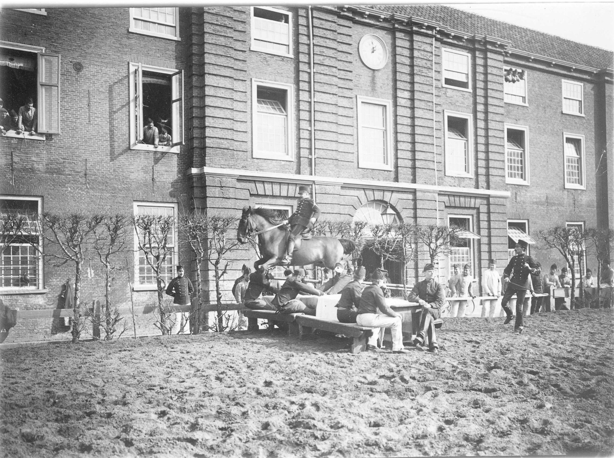 Ryttare hoppar över bord med ett antal sittande personer utanför logementsbyggnad, okänt förband.