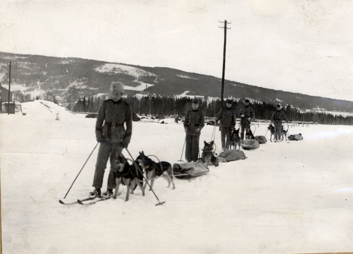 Titel: Soldater åker skidor och hundar drar pulkor med utrustning.