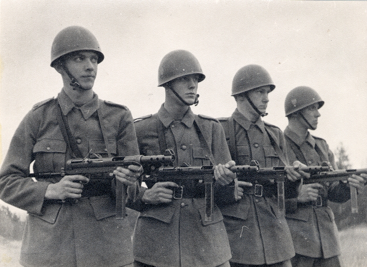 Titel: Soldater poserar med kulsprutepistol m/1945.
