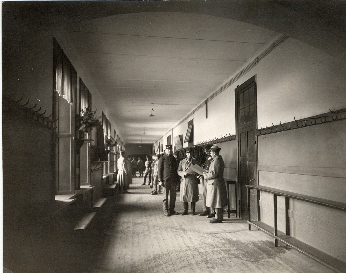 Titel: Soldater i korridor på logemente hos Västmanlands regemente I 18.