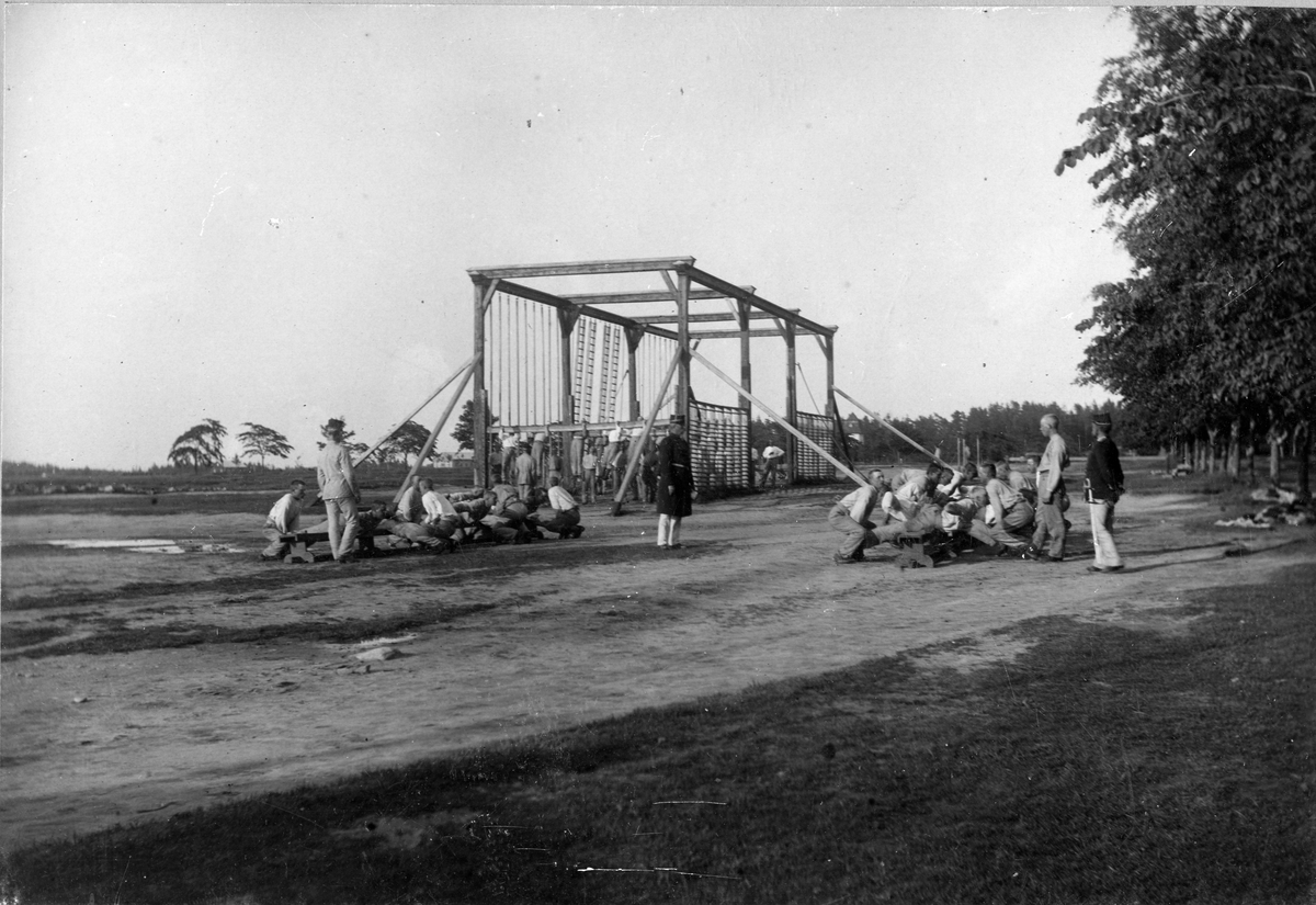 Soldater ur Älvsborgs regemente I 15 vid utomhusgymnastikredskap på Fristad hed.