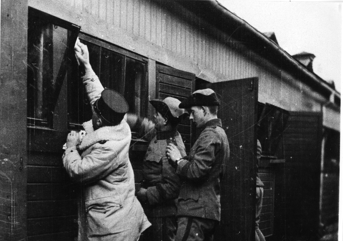 Titel: Soldater putsar fönster på barrack eller stallänga.