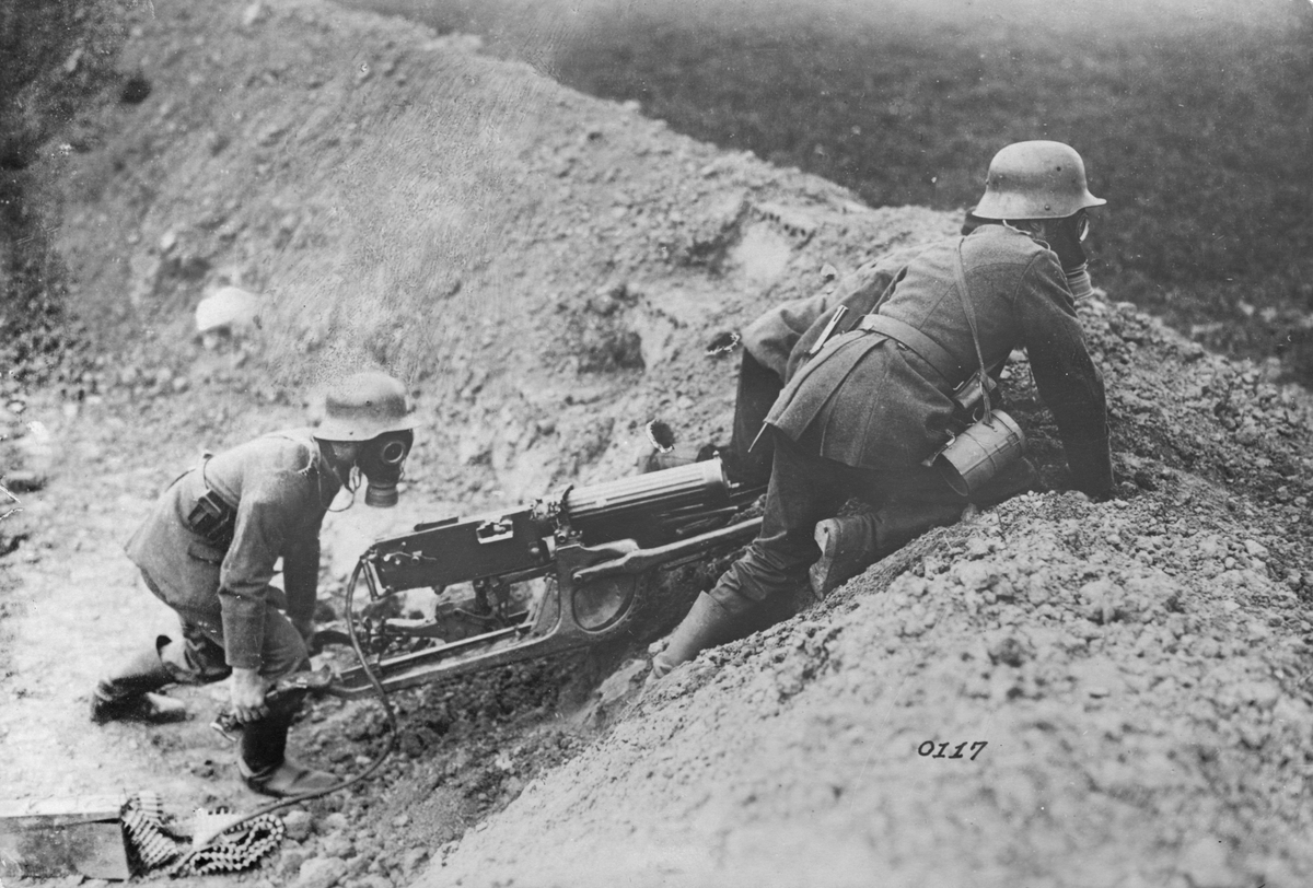 Första världkriget: Med gasmask utrustade tyska kulsprutesoldater, Västfronten.