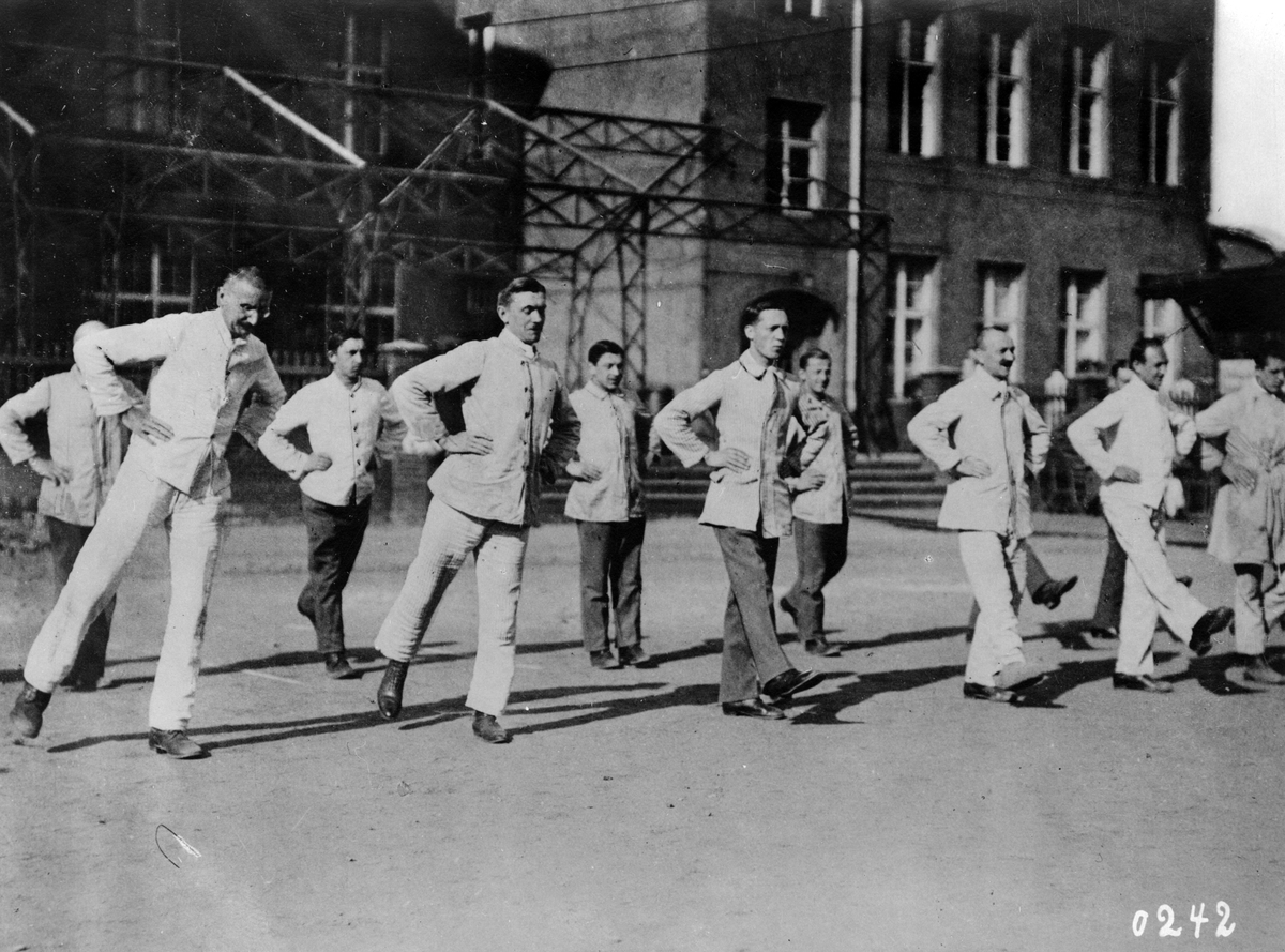 Titel: Första världkriget: Tyska invalider under pågående övning med konstgjorda ben.