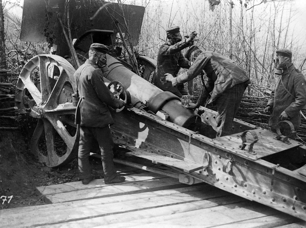 Titel: Första världkriget: Tysk haubits under pågående strid vid västfronten. Servisen skyddad av gasmasker.