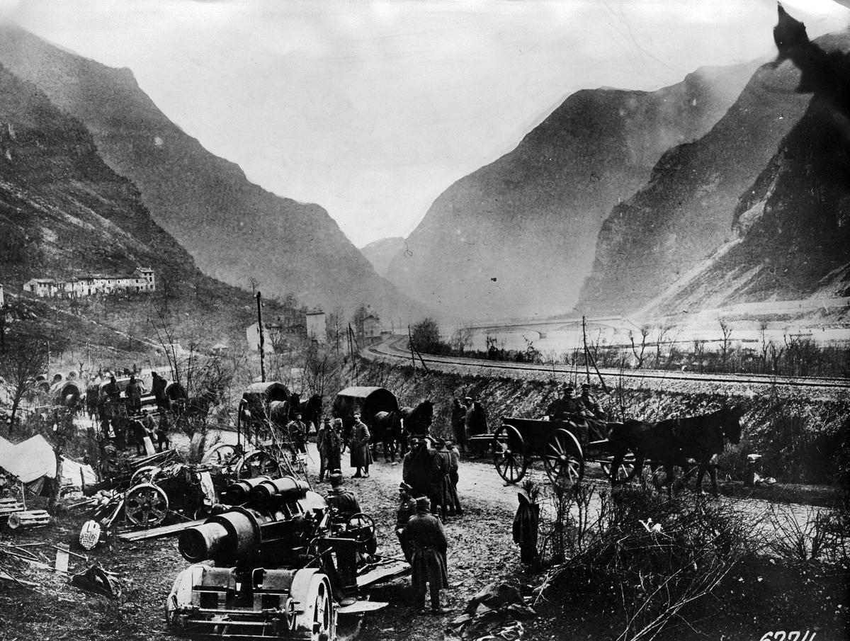Första världskriget: Tyska trängkolonner under frammarsch i övre Piave-dalen. I förgrunden en österrikisk 30,5 cm motormörsare.