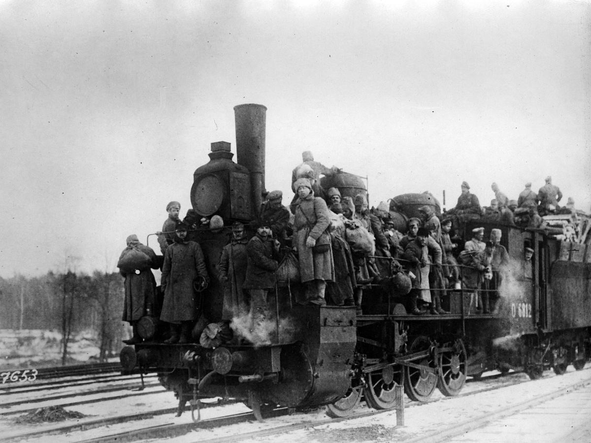 Titel: Första världskriget. Ur rysk fångenskap hemvändande tyska soldater före avtransporten till hemlandet.