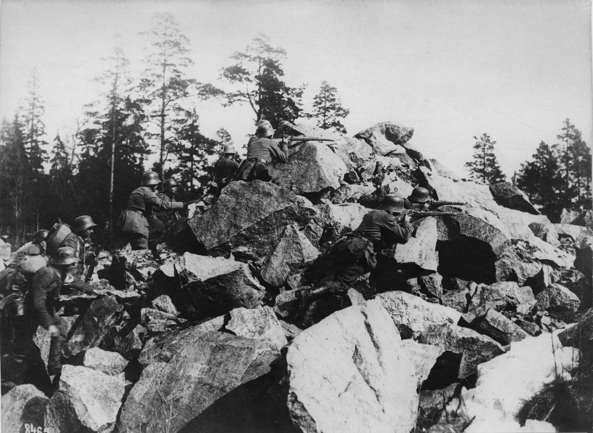 Titel: Finska inbördeskriget: Tyska trupper i strid med rödgardister.