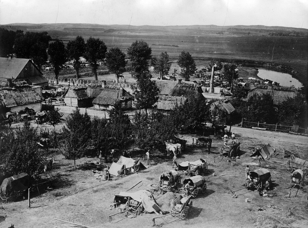 Titel: Första världskriget: Från striderna i Galizien. Tysk trängkolonn i en galizisk by.