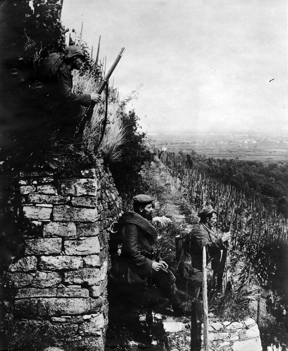 Titel: Första världskriget: Tysk infanteripatrull i Vogeserna.