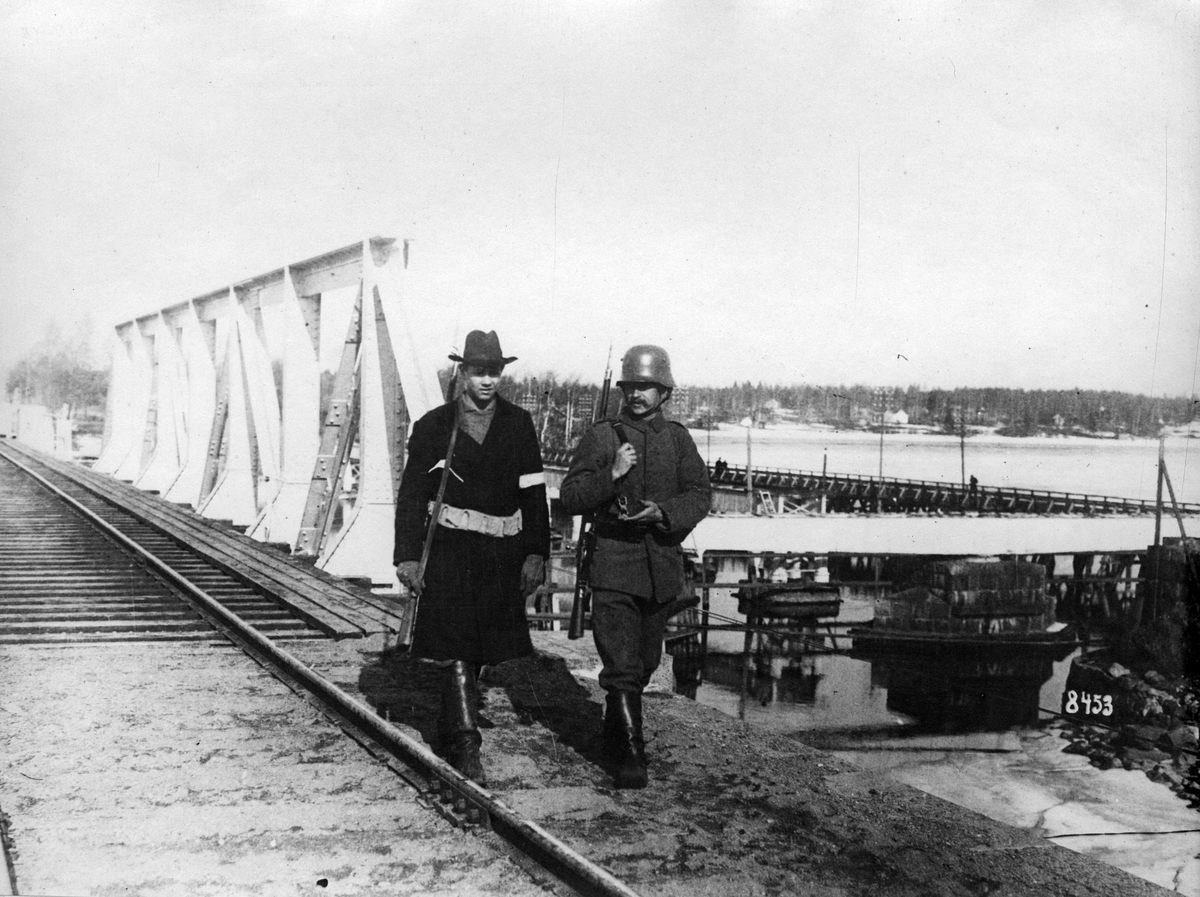 Titel: Finska inbördeskrig: Tysk-finska banvakter vid järnvägen bortom Hangö.