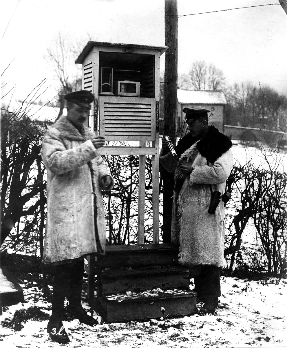 Titel: Första världskriget: Tysk fältobservatorium för väderleksförhållandenas utrönande. Termometern avläses.