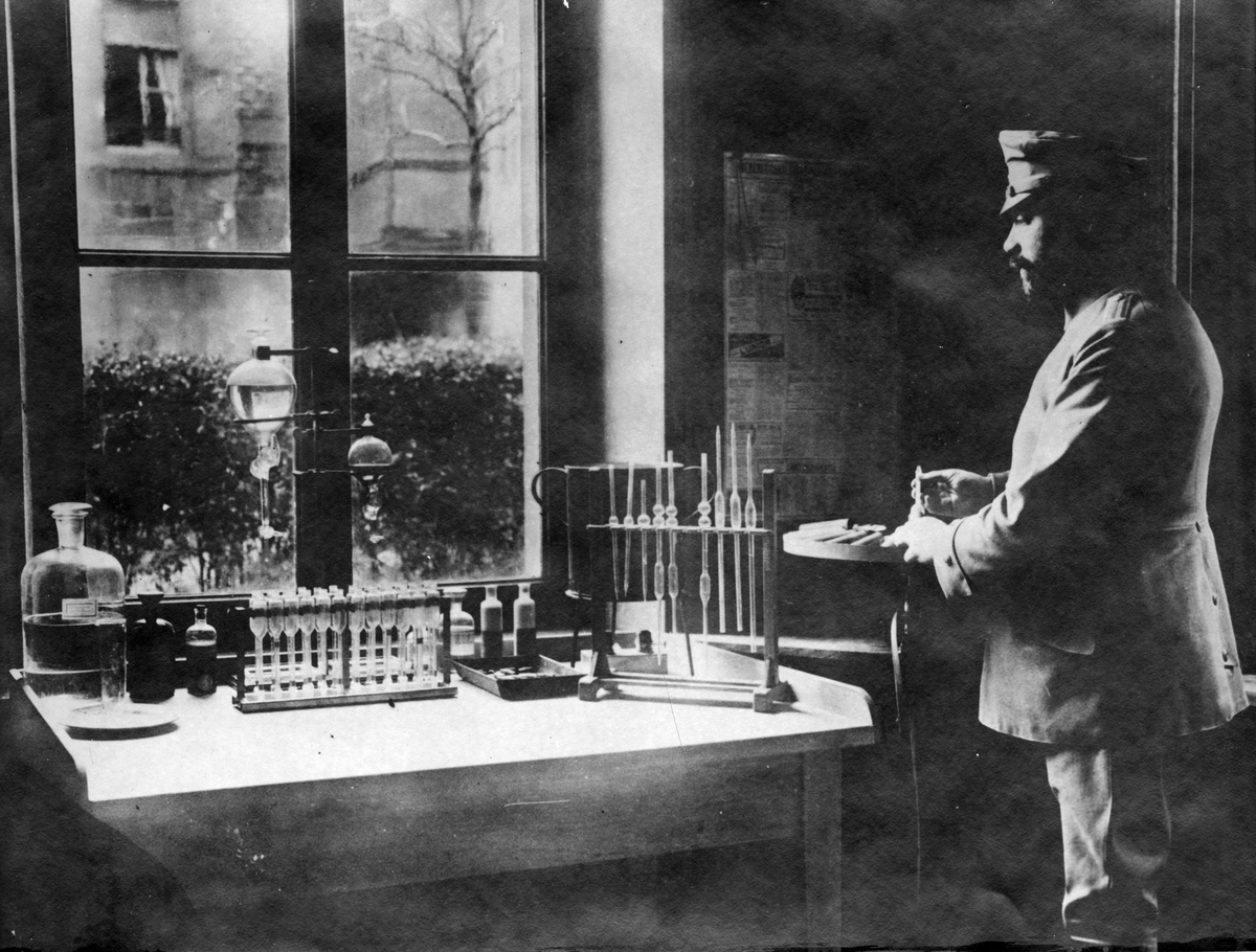 Första världskriget: Laboratoriet i ett tyskt fältmejeri, som förser fältlasaretten med mjölk, smör och ost.
