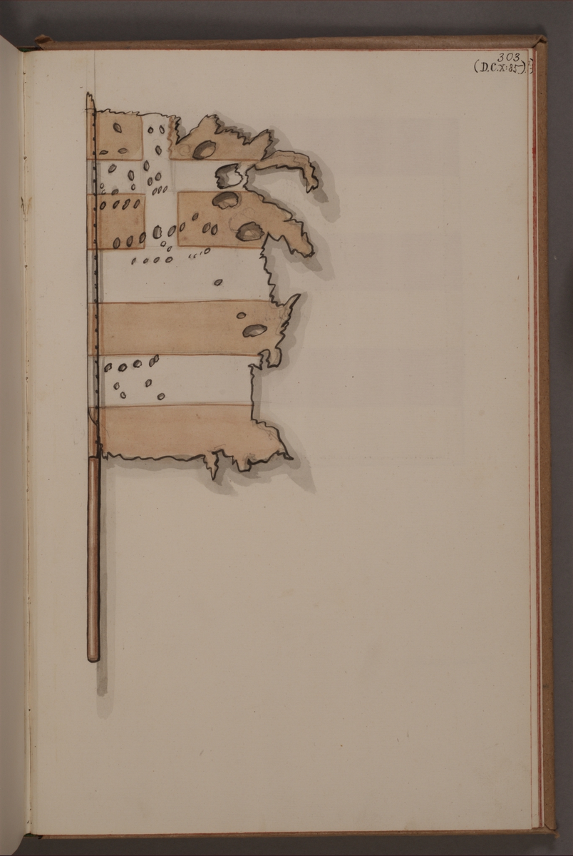 Titel: Avbildning i gouache föreställande fälttecken taget som trofé av svenska armén. Den avbildade fanan finns delvis bevarad i Armémuseums samling, för mer information, se relaterade objekt.