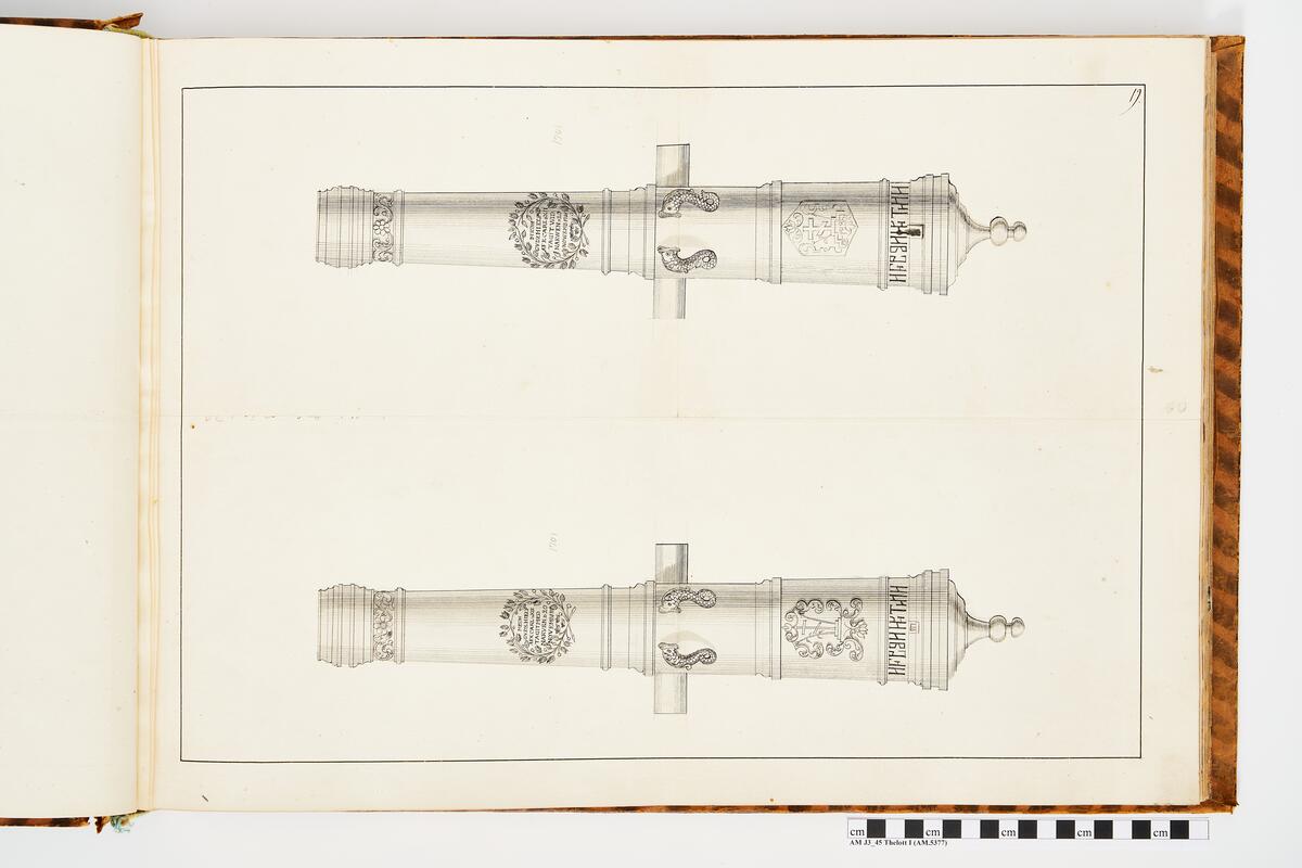 Avbildning föreställande eldrör tagna som troféer av den svenska armén i slaget vid Narva den 20 november 1700. Ingår i volym med avbildade kanontroféer tagna åren 1700-1702.