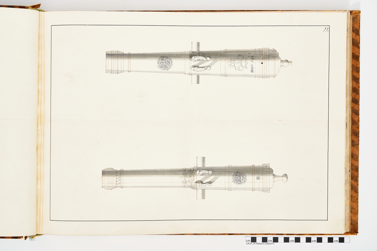 Avbildning föreställande eldrör tagna som troféer av den svenska armén i slaget vid Narva den 20 november 1700. Ingår i volym med avbildade kanontroféer tagna åren 1700-1702.