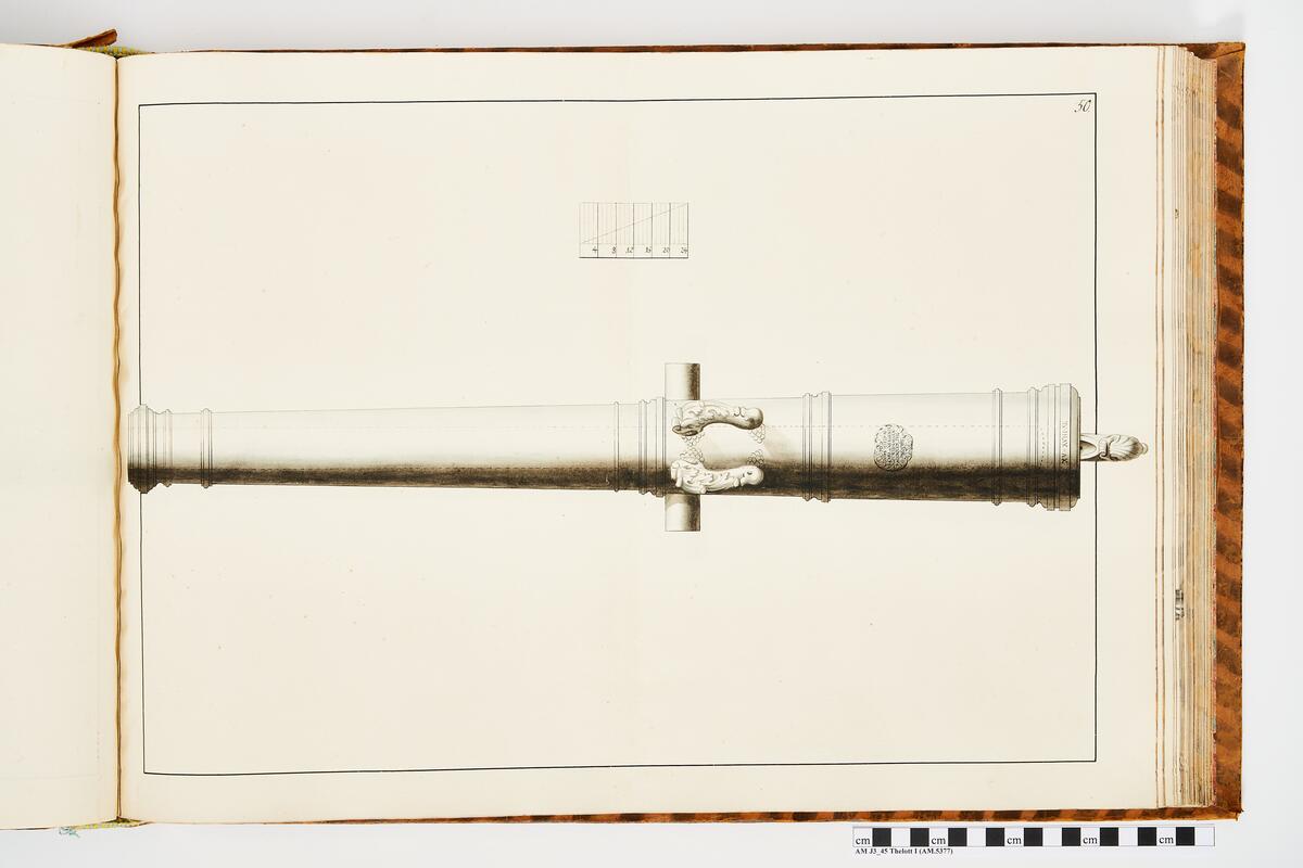 Avbildning föreställande eldrör återtaget som trofé av den svenska armén i slaget vid Narva den 20 november 1700. Ingår i volym med avbildade kanontroféer tagna åren 1700-1702.