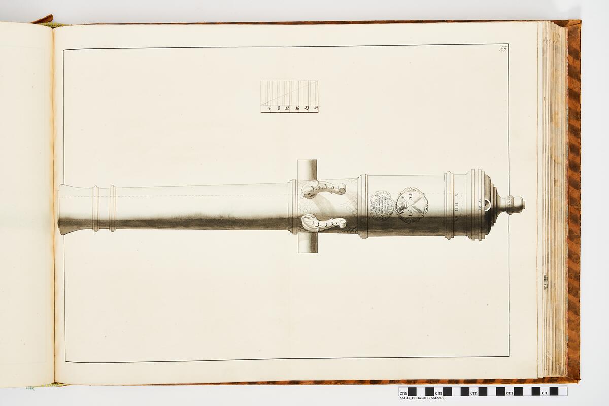 Avbildning föreställande eldrör återtaget som trofé av den svenska armén i slaget vid Narva den 20 november 1700. Ingår i volym med avbildade kanontroféer tagna åren 1700-1702.