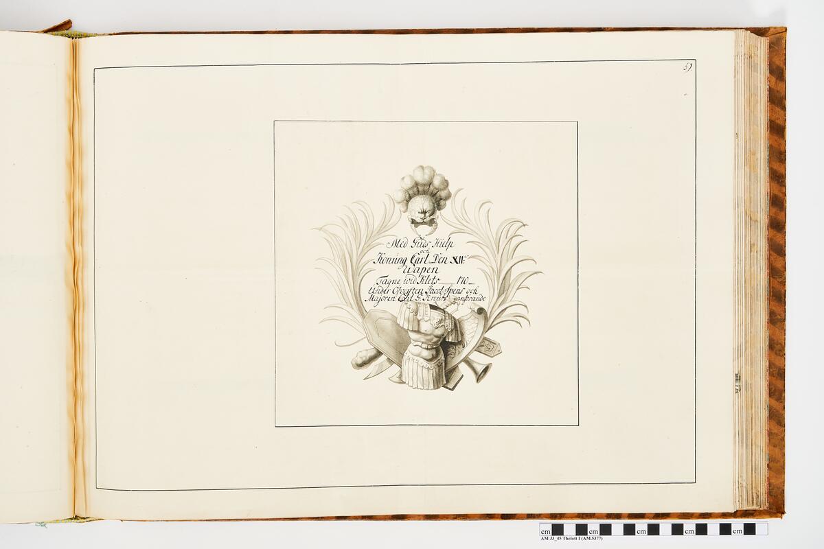 Kartusch till bokverk med avbildningar föreställande eldrör tagna som troféer av den svenska armén åren 1700-1702, utförda av syskonen Anna Maria och Philip Jakob Thelott. Avser troféer erövrade vid Klets 1700 under översten Jakob Spens och majoren Carl G. Kreutz anförande.