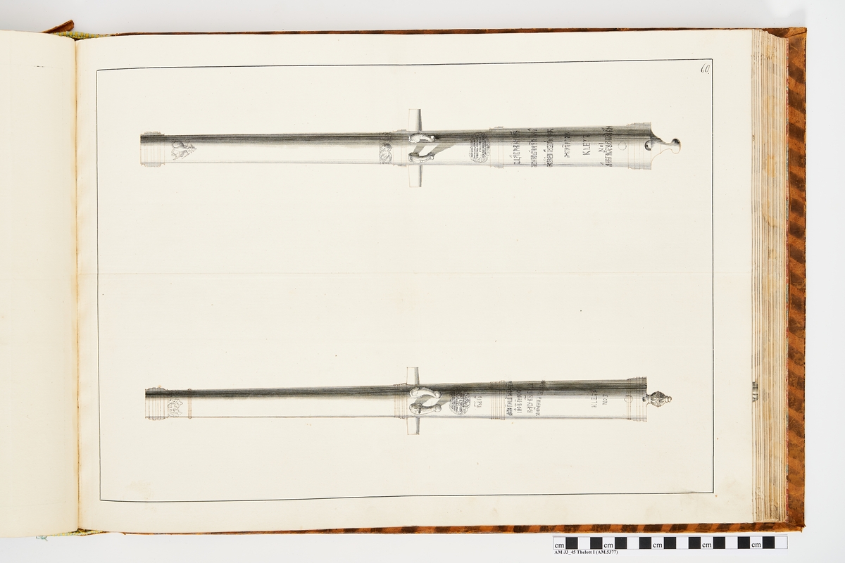 Avbildning föreställande eldrör tagna som troféer av den svenska armén vid Klets 1700. Ingår i volym med avbildade kanontroféer tagna åren 1700-1702.