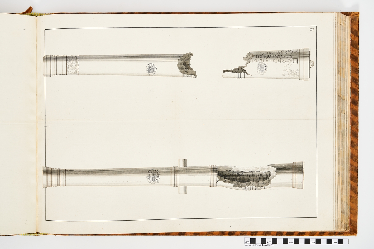 Avbildning föreställande eldrör tagna som troféer av den svenska armén med fästningen Kokenhusen 11 juli 1701. Ingår i volym med avbildade kanontroféer tagna åren 1700-1702.