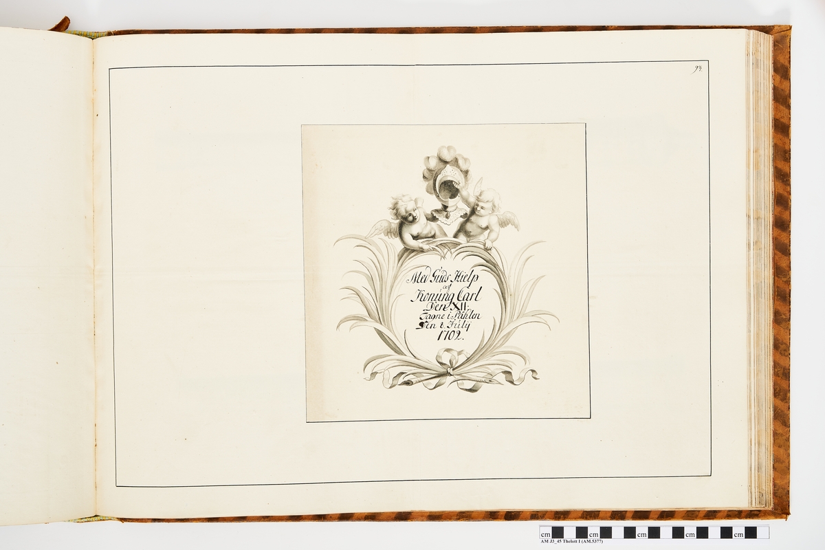 Kartusch till bokverk med avbildningar föreställande eldrör tagna som troféer av den svenska armén åren 1700-1702, utförda av syskonen Anna Maria och Philip Jakob Thelott. Avser troféer tagna i Polen den 8 juli 1702.
