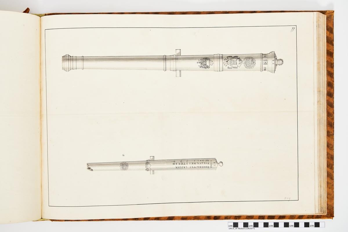 Titel: Avbildning föreställande eldrör tagna som troféer av den svenska armén i Polen den 8 juli 1702. Ingår i volym med avbildade kanontroféer tagna åren 1700-1702.